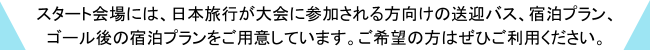 スタート会場には日本旅行が大会に参加される方向けに、JR三ノ宮駅からの送迎バスや宿泊プランを用意しています。ご希望の方はぜひご利用ください。 ※お車でスタート会場にいらっしゃる場合は、スポーツエントリーにて駐車場オプションを必ず選択してください。 |